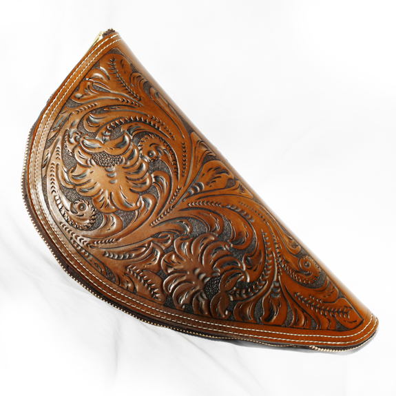 Thank you for the superb work on the pistol rug. The tooling is superb and more skillfully rendered than the tooling shown in the photos I sent you of the antique case. Thank you for your time in making this an item I will be proud to keep and pass on. It will only get better with age and use.